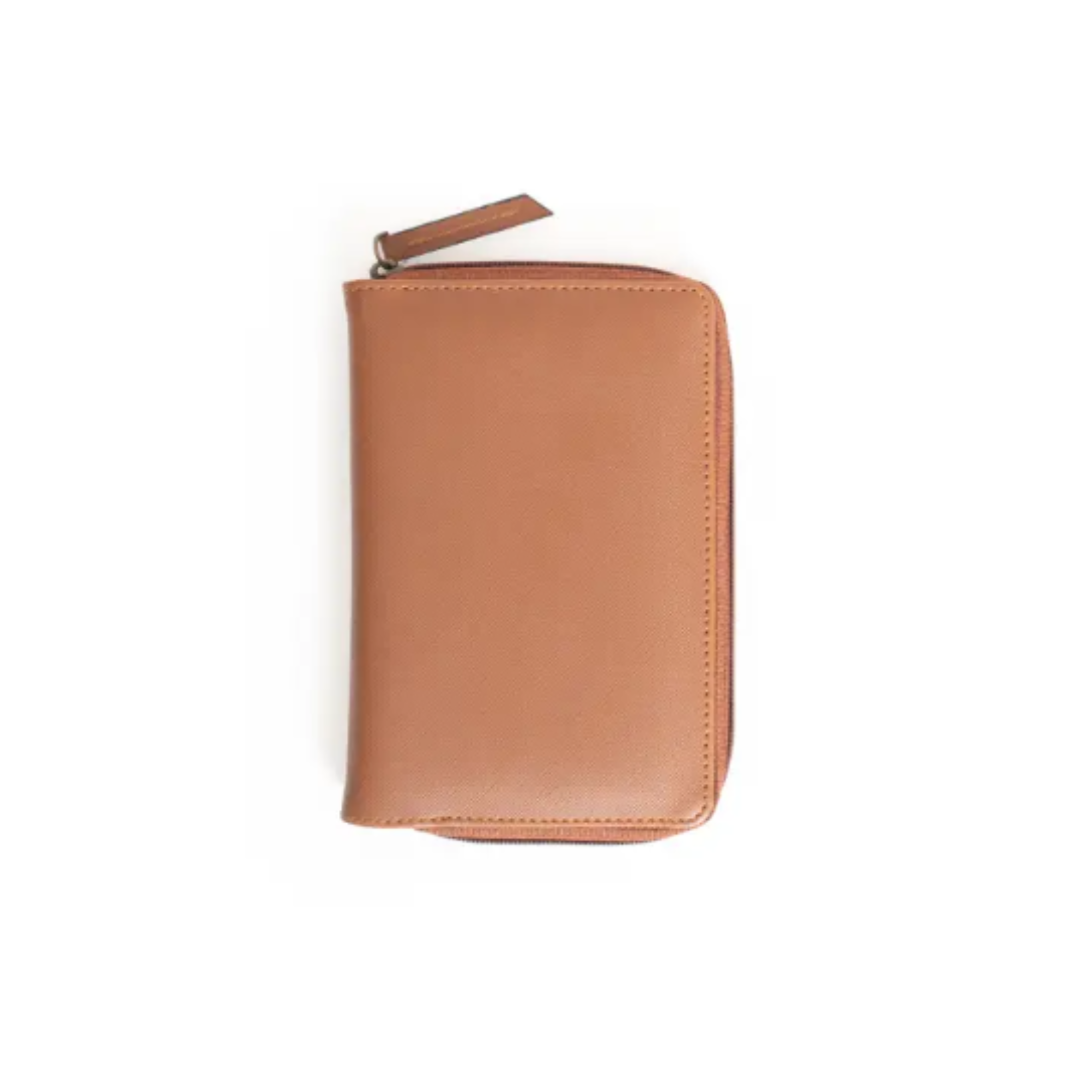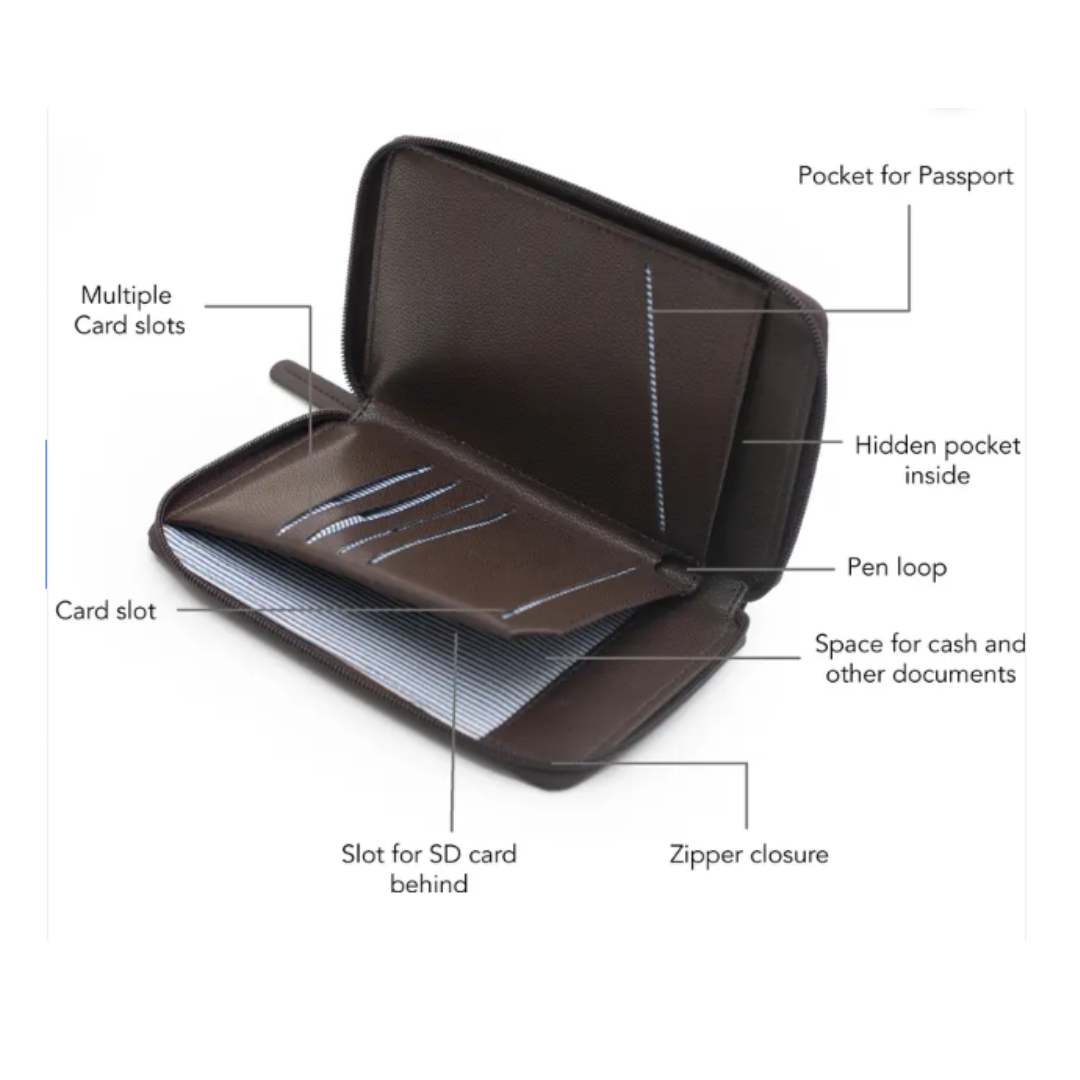 Effortlessly organize your travel essentials with our Passport Pouch, featuring smartly designed slots and sleeves for your passport, boarding pass, important documents, cards, currency, and pen